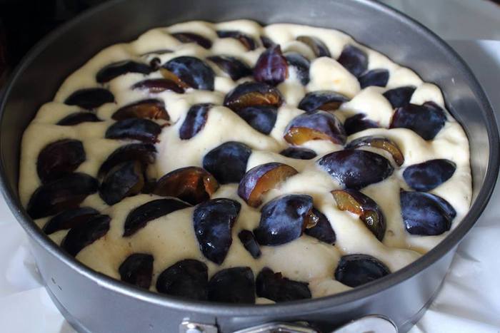 Форму застелить пергаментом (у меня 26 см), выложить тесто и затыкать его половинками слив.