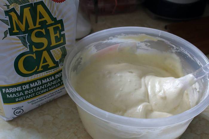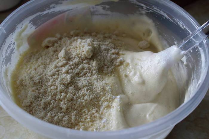 Добавить кукурузную муку и разрыхлитель. Размешивать заворачивающими движениями, чтоб сохранить объем взбитых белков.