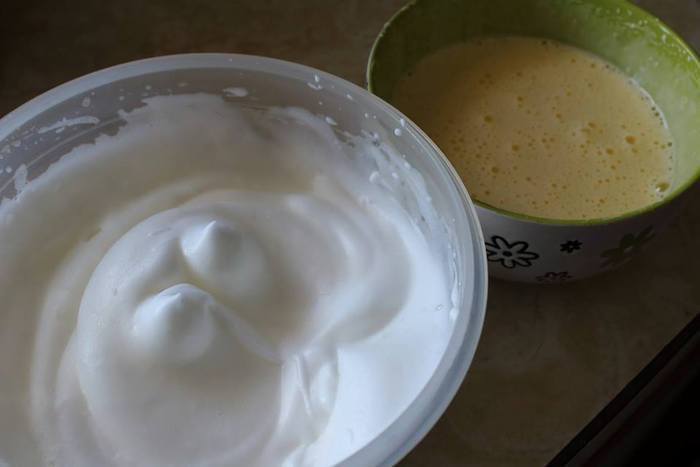 Яйца разделить на желтки и белки. Желтки взбить с половиной сахара в пену, белки со второй половиной до устойчивых пиков. Аккуратно лопаткой смешать.