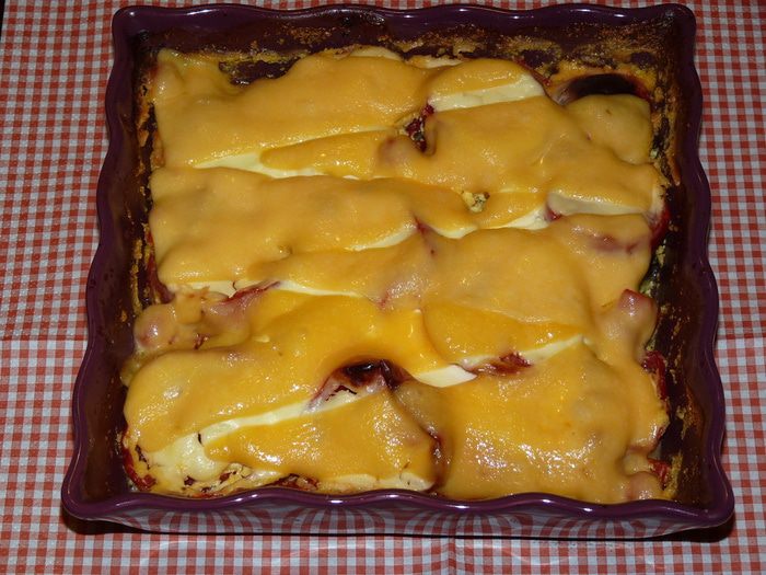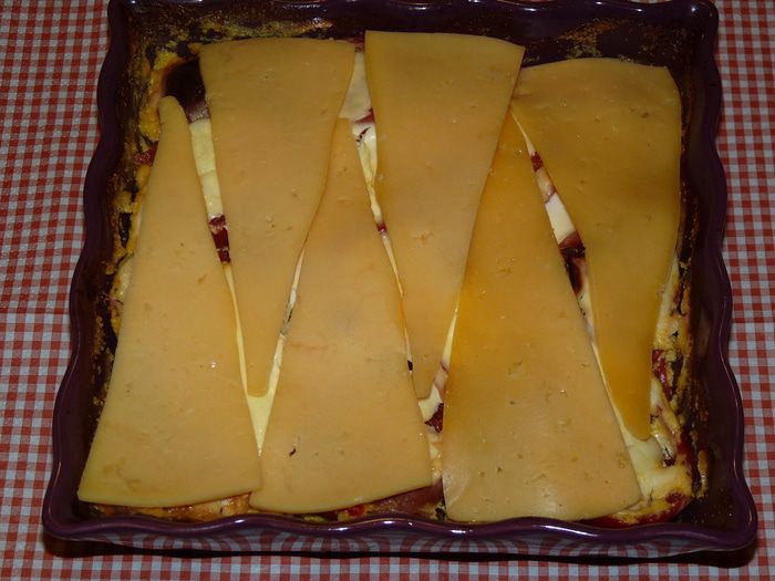 Сыр натереть (или использовать тонко нарезанный), выложить сверху.