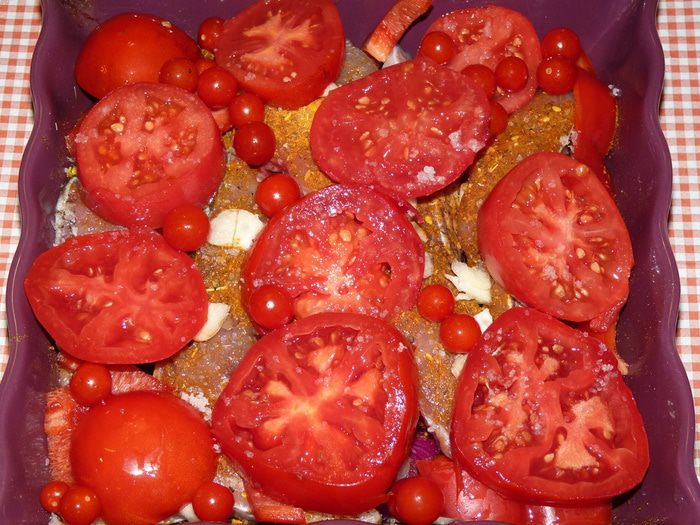 Помидоры нарезать кольцами и выложить сверху.