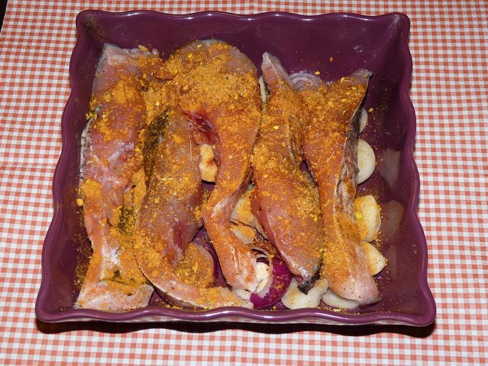 Рыбу уложить на лук. Добавить специи.