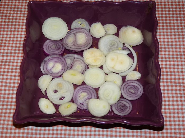 Форму для запекания смазать растительным маслом. Лук нарезать кольцами, выложить в форму.