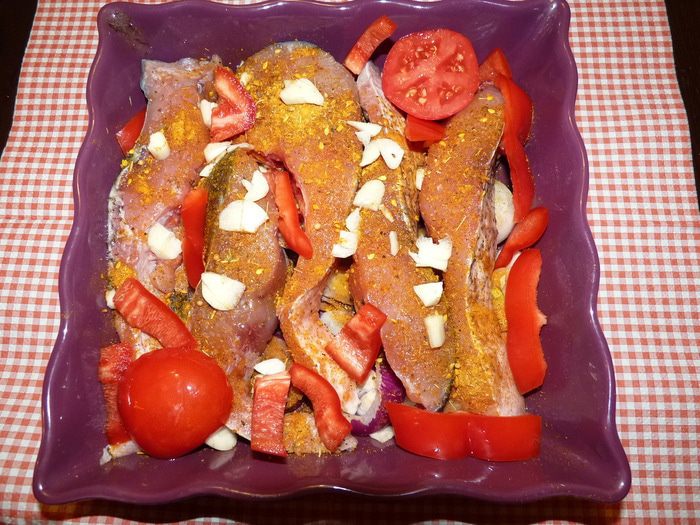 Чеснок раздавить и добавить к рыбе. Болгарский перец нарезать соломкой, уложить между рыбой.