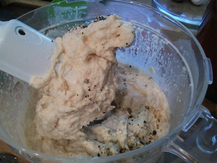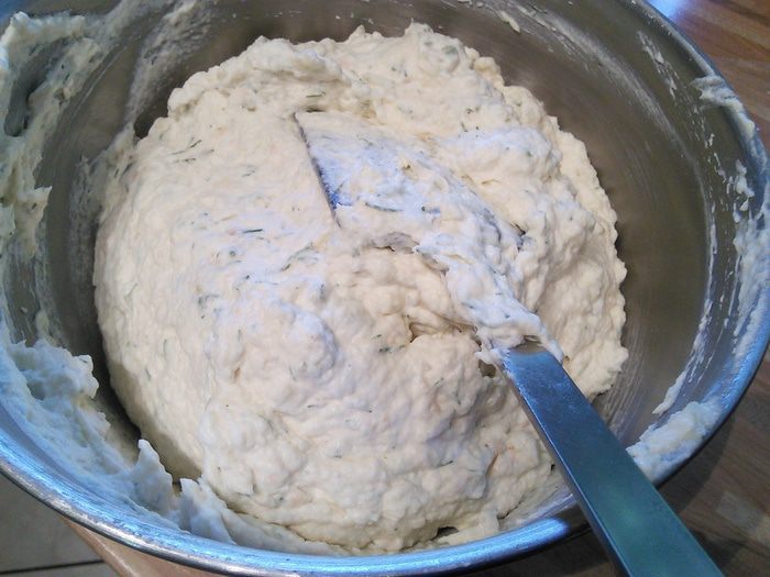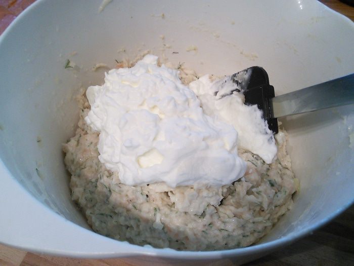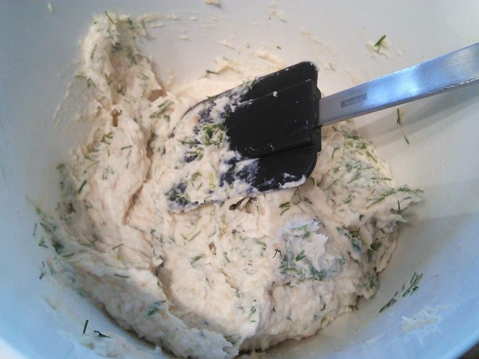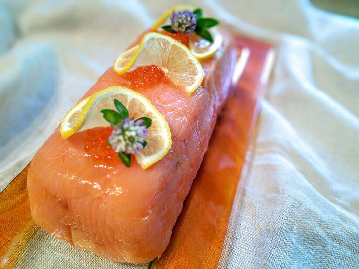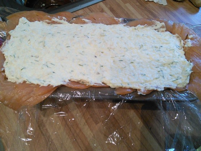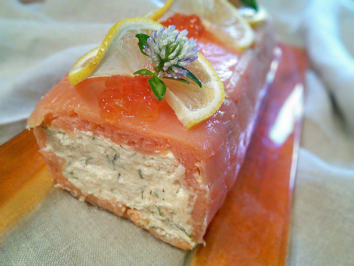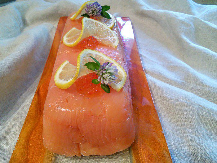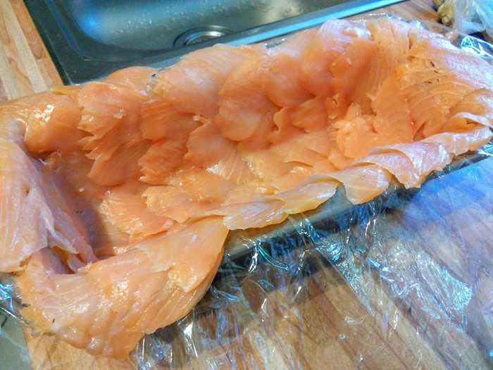 Прямоугольную форму для террина (~ 1,25 л объемом) слегка смазать маслом и выложить пищевой пленкой с запасом. Дно и стенки выложить лососем тонкой нарезки в нахлест (выбрать самые симпатичные кусочки), так же оставляя запас лосося, чтобы затем прикрыть террин. Если у вас не получилось оставить достаточно длинные свисающие кусочки лосося, чтобы затем прикрыть террин, то отложите несколько ломтиков рыбки из общего количества.