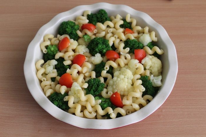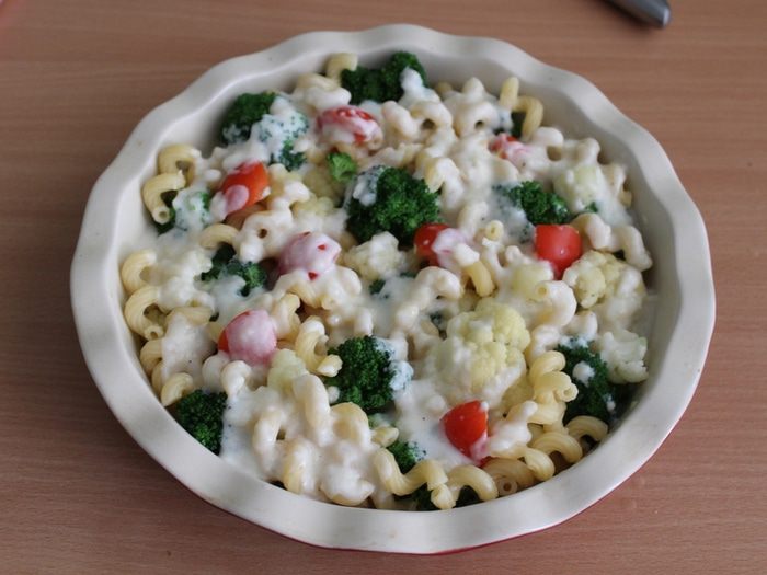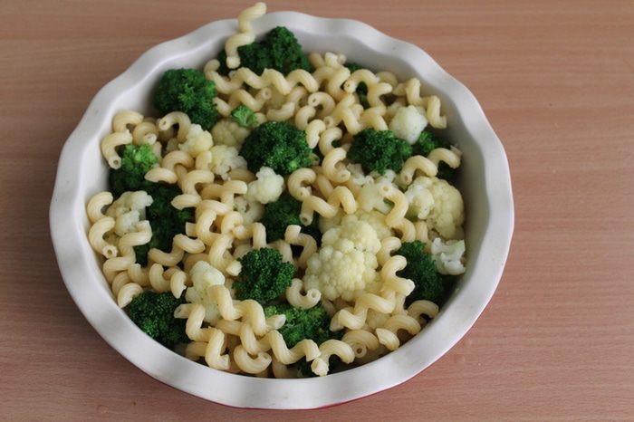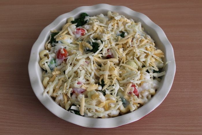 Макароны отварить до полуготовности, овощи бланшировать 2 — 3 минуты в кипящей, подсоленной воде. Выложить макароны и овощи в форму для выпечки.
