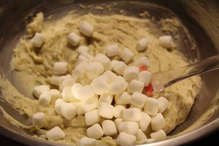 Мелкое маршмаллоу положить в тесто сразу, если крупное измельчить сначала.