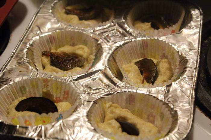В формочки для маффинов положить тесто на половину, внутрь положить кусочек сливы (можно и черешню, или малину или других ягодок).