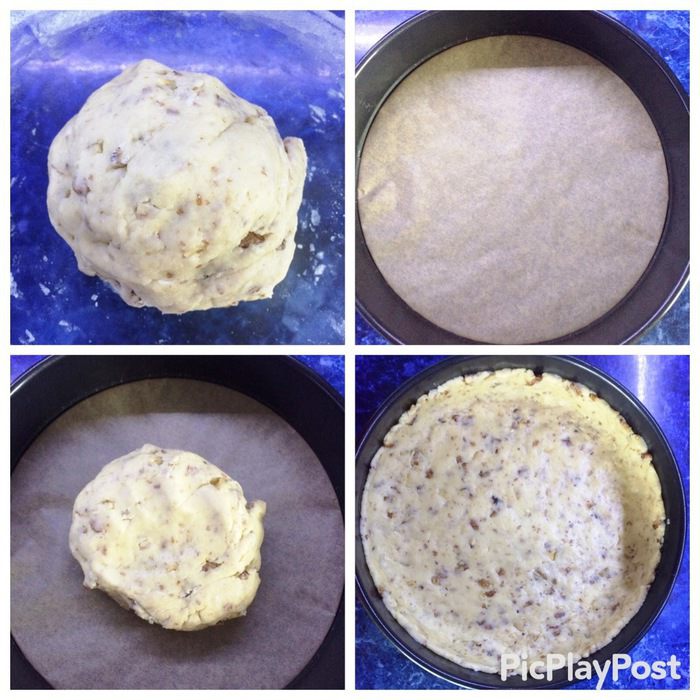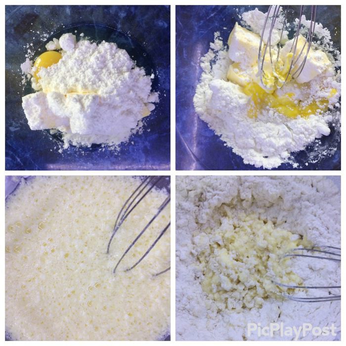 Печенья дома не было, лил дождь, в магазин ой как не хотелось. Испекла основу для чизкейка, как говорится, из подручных средств. Для этого размягченное сливочное масло, яйцо, щепотку соли и сахарную пудру взбиваем. Добавляем просеянную муку с разрыхлителем, замешиваем тесто.