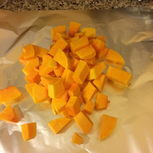 Все продукты должны быть комнатной температуры. Для тыквенного пюре нам потребуется 300 г тыквы. Духовку нагреть до 200°С, тыкву нарезать кубиками, завернуть в фольгу и запечь до мягкости. Остудить и пюрировать блендером.