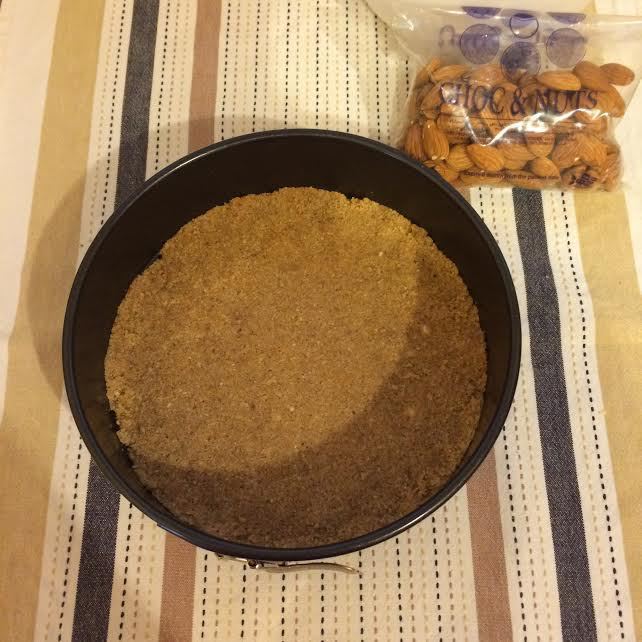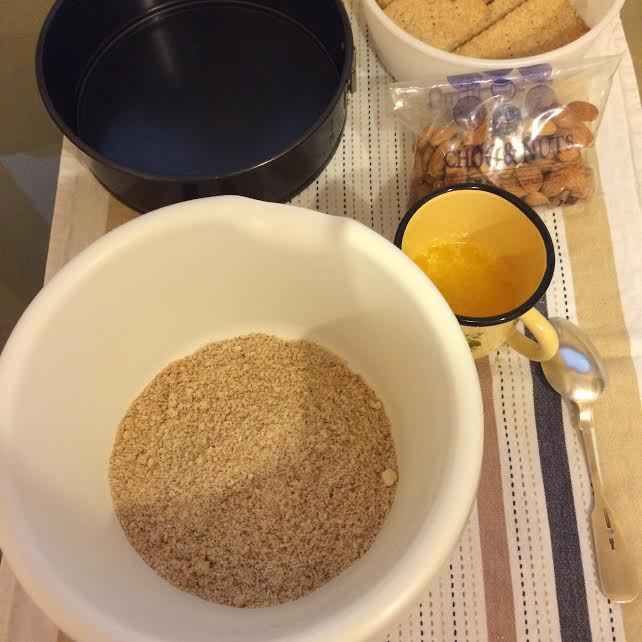 Уменьшить температуру духовки до 170°С. В миске смешать молотое печенье и молотый миндаль. Добавить растопленное сливочное масло.