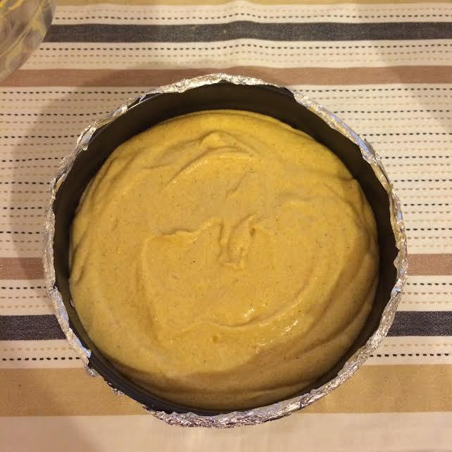 Уменьшить температуру духовки до 160°С. Форму завернуть в двойной слой фольги. Аккуратно перелить начинку в форму и разровнять. Поставить форму с чизкейком еще в одну глубокую форму и залить горячей водой, вода должна доходить до половины.