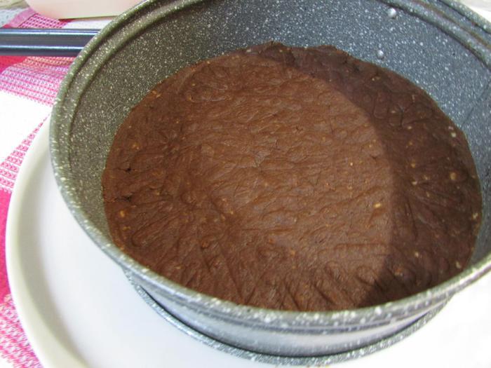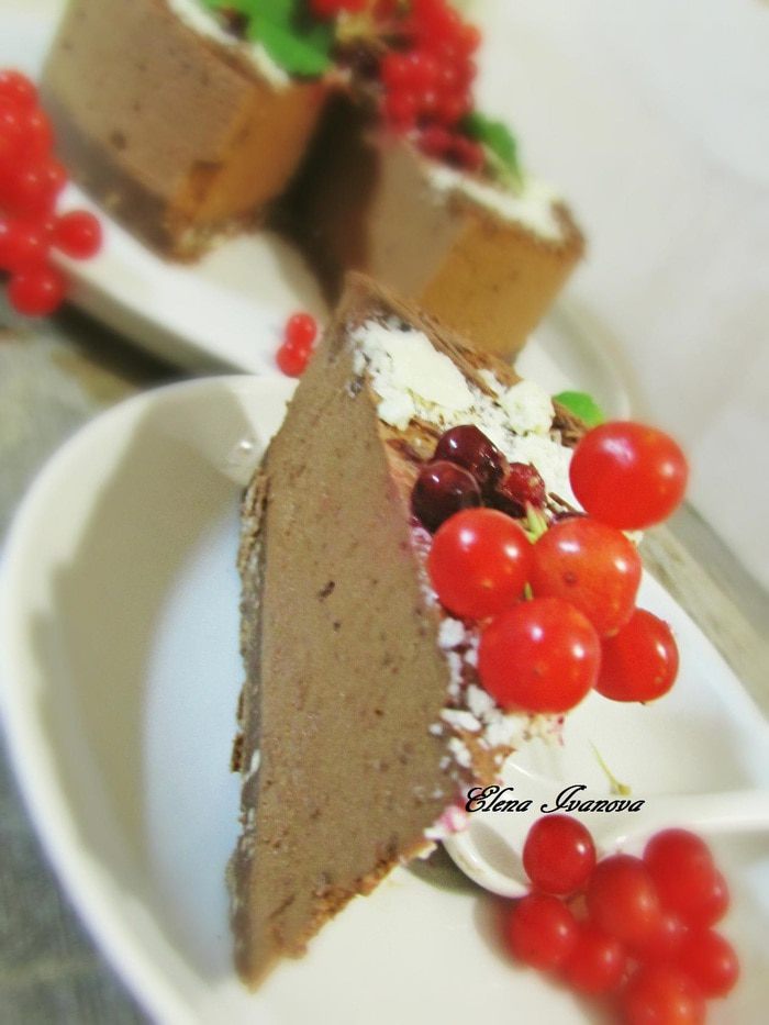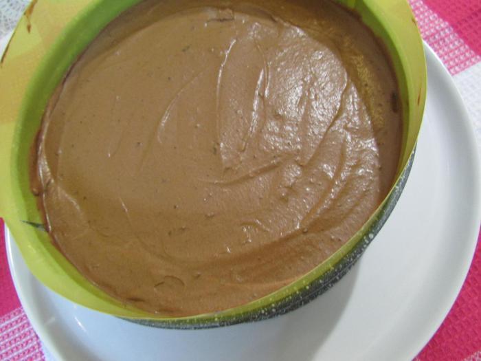 Перелить шоколадную массу в форму (я проложила по кругу пластинки, вырезанные из файла, слегка смазала растительным маслом, прям совсем чуть-чуть) на основу из печенья. Убрать в холодильник на ночь (на 8 — 10 часов). Перед подачей украсить на свой вкус.