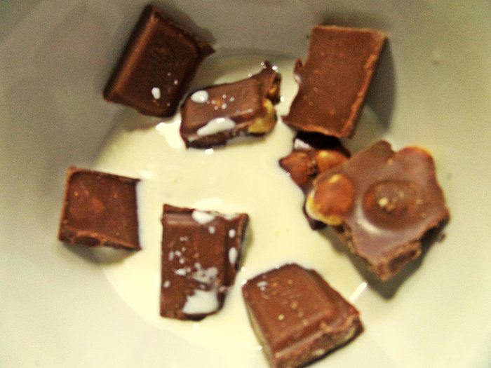 Растопить на водяной бане со сливками или молоком.
