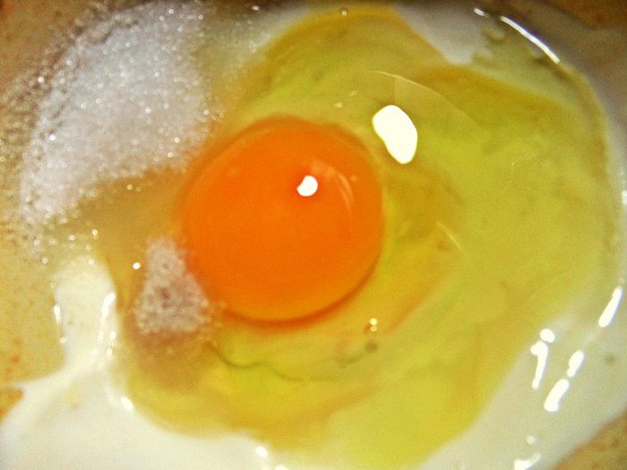 Сметану развести водой, смешать с яйцом, сахаром и ванилью.