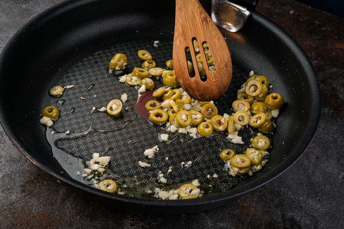 Очистите чеснок, мелко порубите. Нарежьте оливки кружками и поджарьте вместе с чесноком на сковороде с оливковым маслом.
