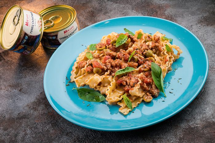 Добавьте к чесноку и оливкам тунца, хорошо перемешайте соус, дайте ему прогреться.
