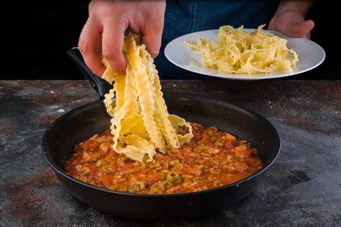 Добавьте макароны к соусу, немного оливкового масла и аккуратно перемешайте.