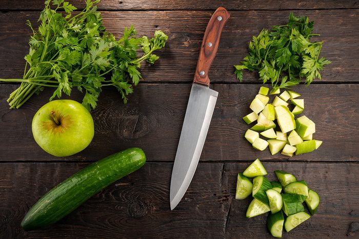 Промойте петрушку, обсушите. Огурец и яблоко нарежьте, и сложите все в чашу блендера.
