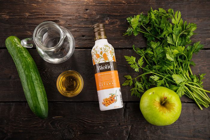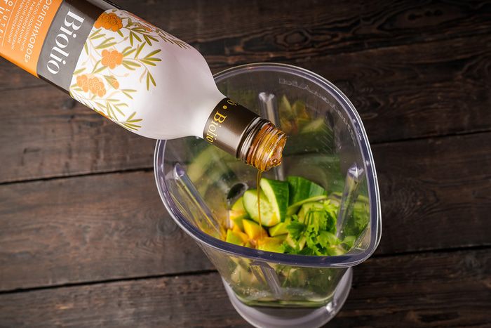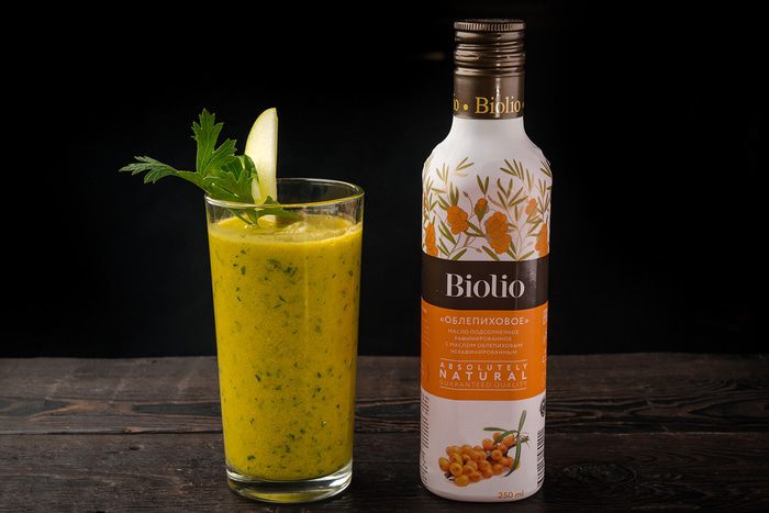 Добавьте теплой воды 50–100 мл. И все измельчите блендером. Добавьте 1 ч. л. облепихового масла и еще раз пробейте смузи блендером.