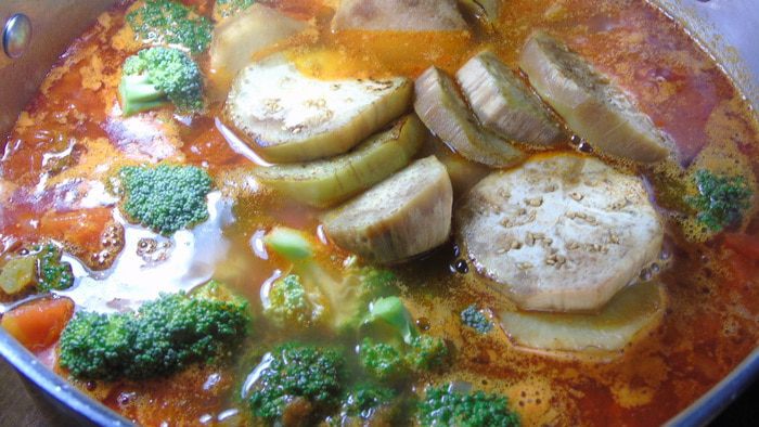 Положите баклажаны и брокколи, предварительно разобрав ее на соцветия. Варите еще 2 — 3 минуты. Выключите огонь, накройте крышкой и дайте 5 минут настояться!