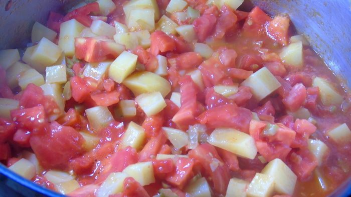 Влейте томаты в собственном соку от ТМ «Помидорка» и добавьте нарезанный свежий помидор, предварительно ошпарив и сняв шкурку. Тушите, помешивая еще 5 — 7 минут.
