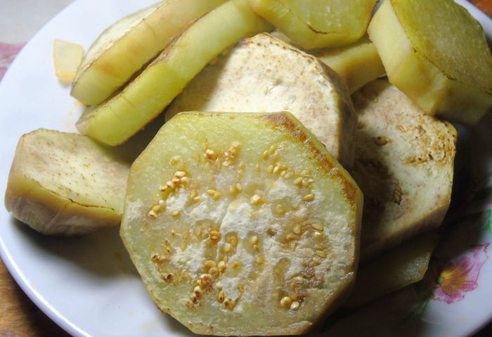 Баклажан очистите, нарежьте кружочками и слегка обжарьте на сковороде. Так баклажан будет держать форму в супе.