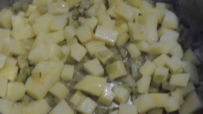 Затем добавьте картофель, который тоже нарежьте не большими кубиками, тушите, периодически помешивая, минут 5 — 7.