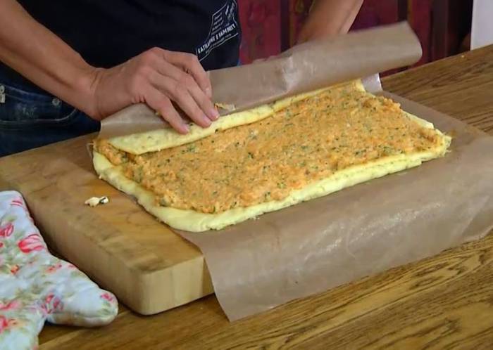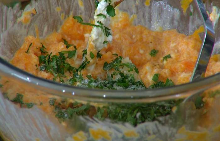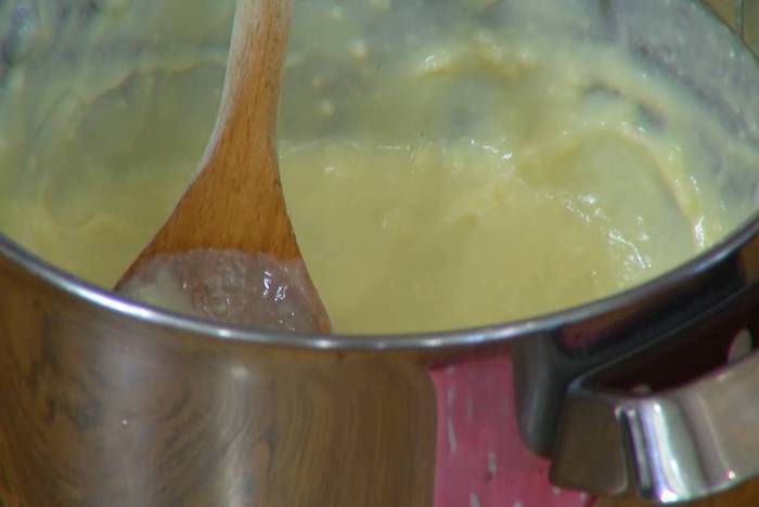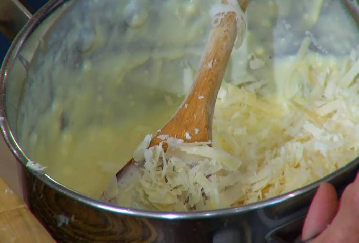 Приготовить соус бешамель: сливочное масло растопить на маленьком огне, всыпать муку и, непрерывно помешивая деревянной лопаткой, заварить массу, затем, продолжая вымешивать, медленной струйкой влить молоко и, не снимая с огня, взбить все погружным блендером (если получилось слишком густо, влить еще немного молока). Слегка прогреть, по одному ввести желтки, каждый раз вымешивая, затем снять соус с огня и еще несколько минут продолжать вымешивать.