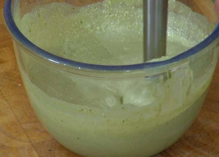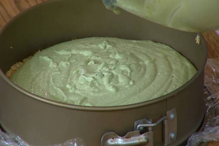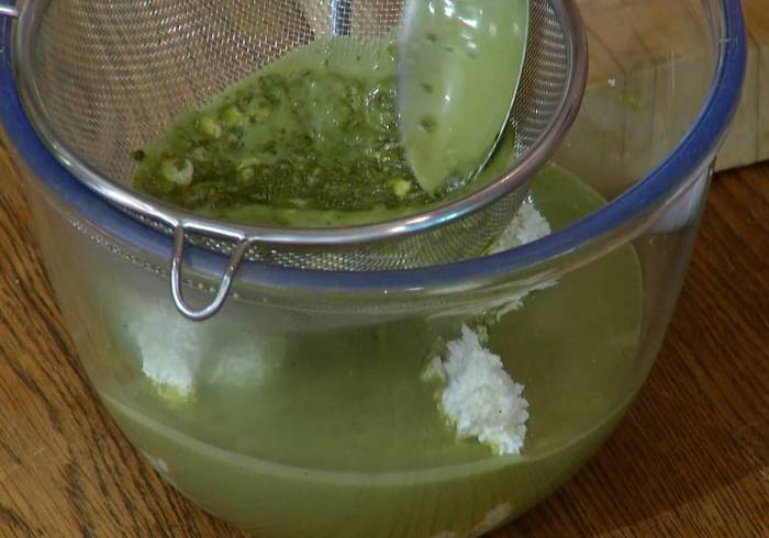 Из половинки лайма выжать 2 ст. ложки сока и добавить в молочно-желатиновую смесь, все перемешать, процедить через сито, влить к творогу со сливочным сыром и еще раз перемешать.