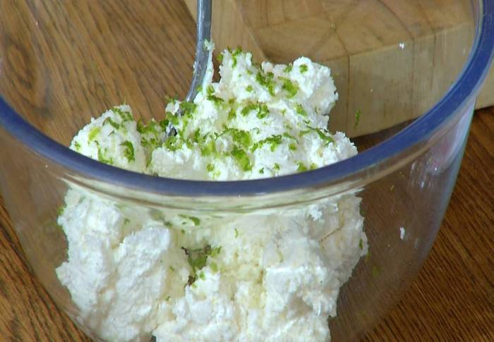 Цедру лайма натереть на мелкой терке и добавить к творогу с сыром.