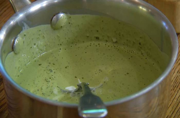 Кокосовое молоко влить в небольшую кастрюлю, всыпать зеленый чай, перемешать и прогреть на небольшом огне, не доводя до кипения.