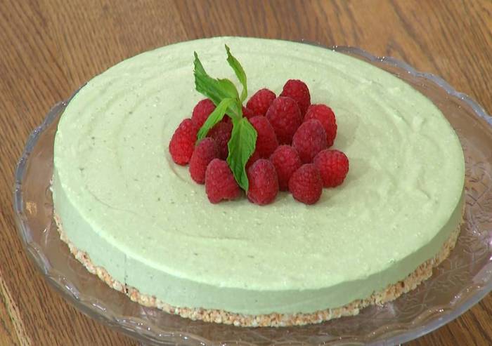 Охлажденный чизкейк вынуть из формы, украсить малиной и листьями мяты.