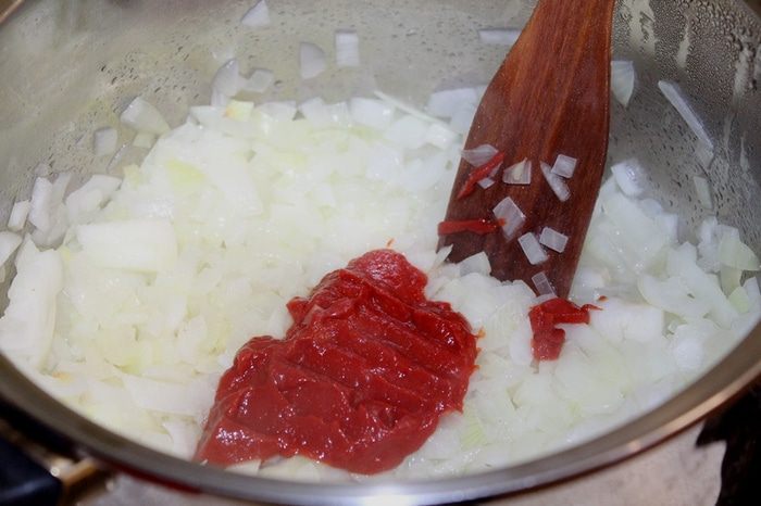 Репчатый лук мелко нарезать, обжарить на растительном масле до мягкости 12-15 минут. Добавить томатную пасту. Тушить 10 минут.