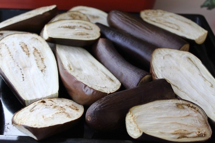 Баклажаны запечь в духовке 30 минут при температуре 200°С.