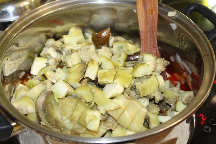 С баклажанов снять кожицу, нарезать их кусочками, добавить в луковую смесь. Добавить все специи, уксус, измельченный чеснок. Тушить 15-20 минут.