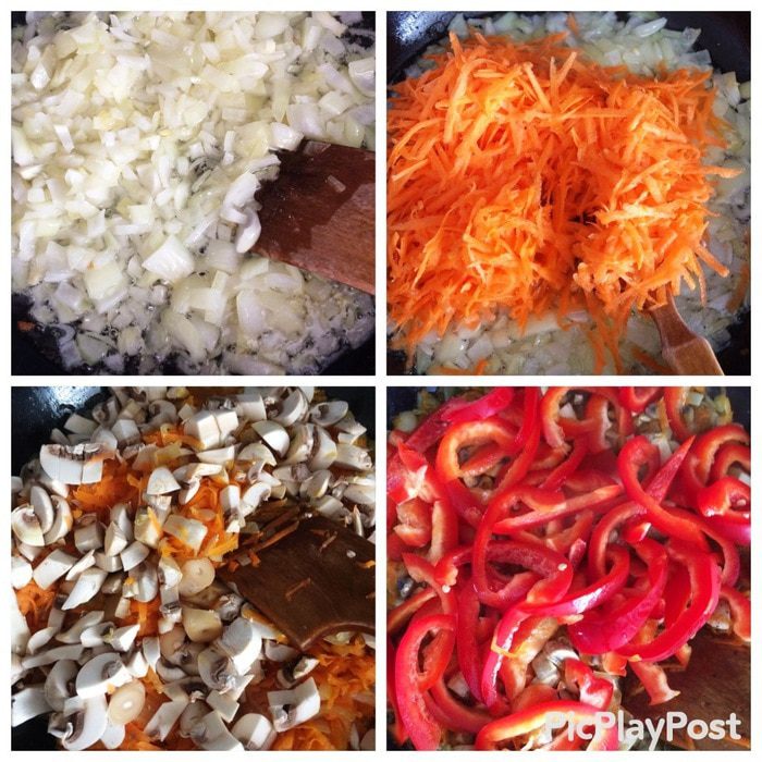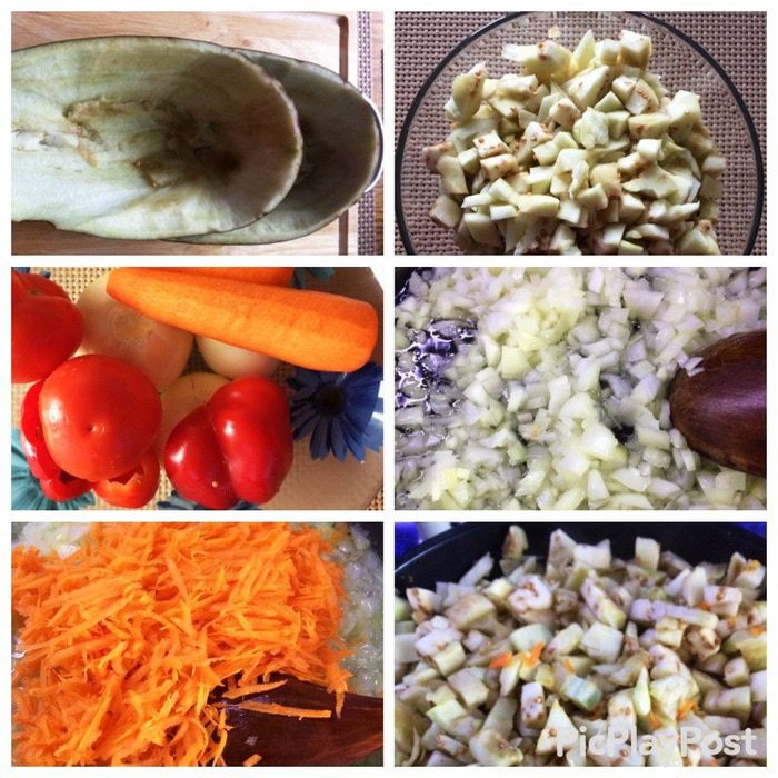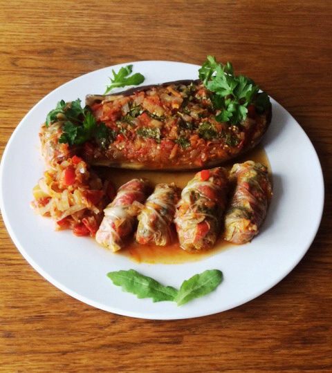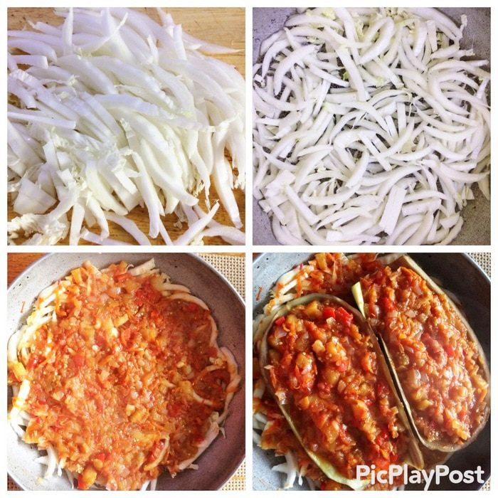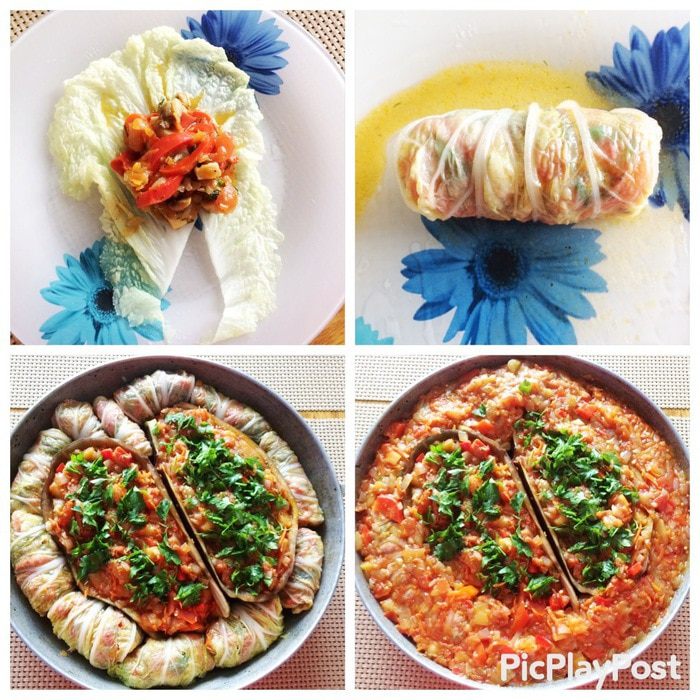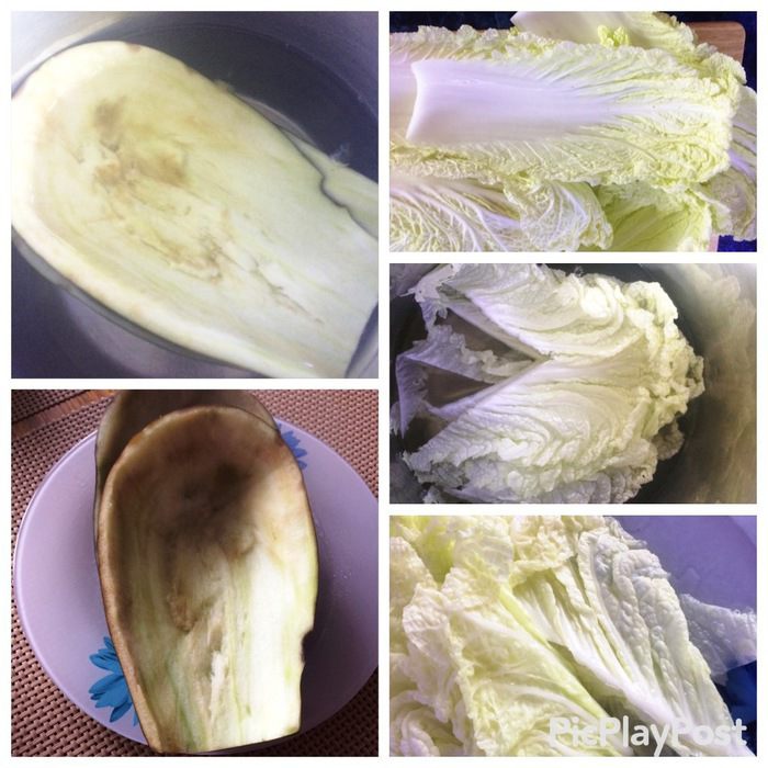 Так как я фаршировала и баклажан, то я его немного бланшировала в кипящей воде, чтобы кожура стала мягче. Пекинскую капусту разобрать листьями, срезать утолщения и опустить в кипящую воду и тут же их вынуть, чтобы не разварились, секунд 30 — 40 примерно, этого достаточно, т.к. они очень нежные, просто должны чуть обмякнуть, чтобы можно было легче свернуть голубец.