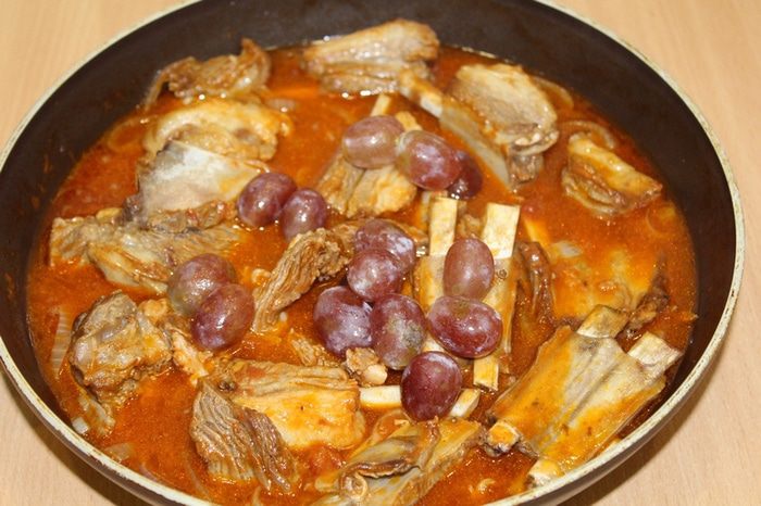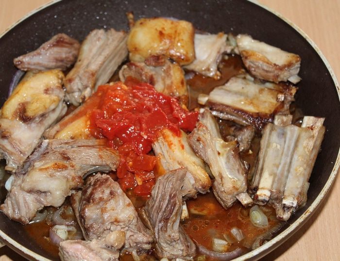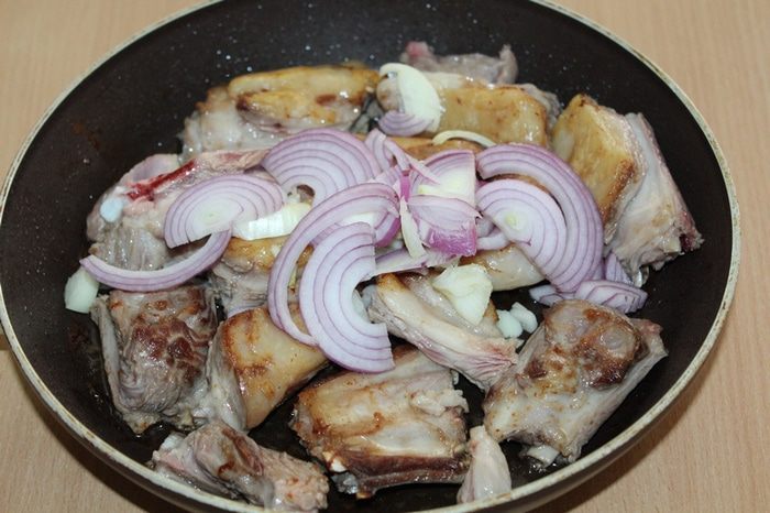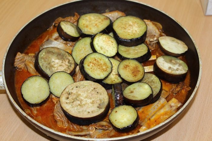 Когда мясо станет мягким, добавить баклажаны, предварительно обжаренные в другой сковороде. Аккуратно все перемешать, чтобы кружочки баклажан остались целыми. Потомить на медленном огне 5 минут. Выключить плиту, дать настояться 5 минут. На гарнир можно подать рис.