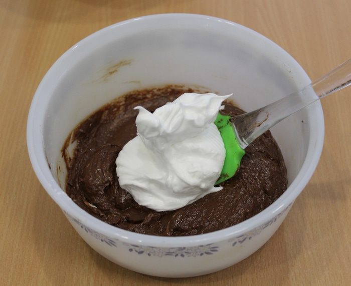 Осторожно частями ввести белки, перемешивая лопаточкой снизу-вверх.