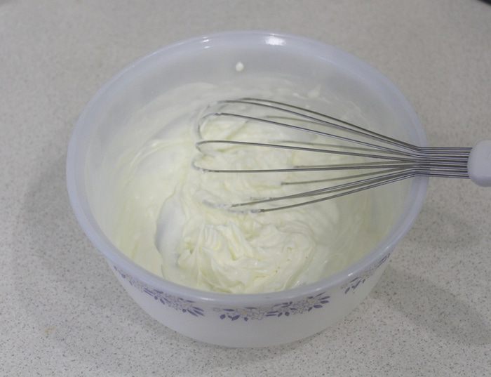 Белки взбить, добавить частями сахарную пудру, снова взбить.