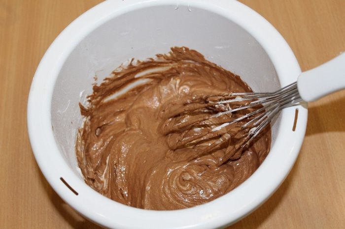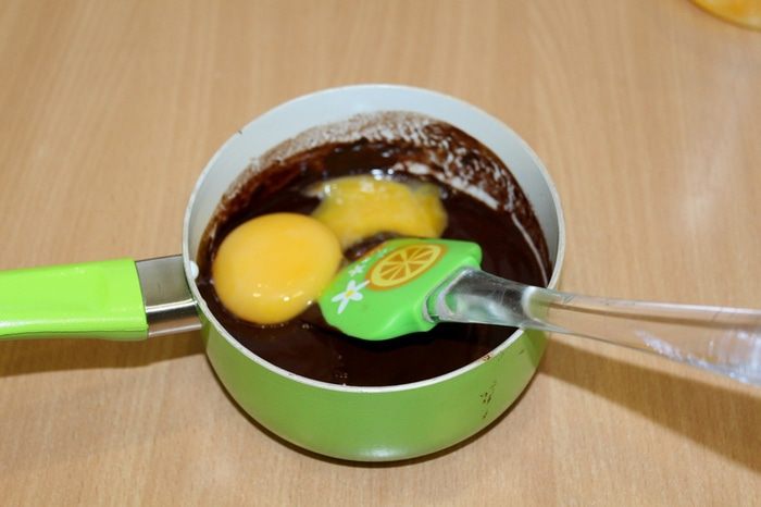 По одному ввести яйца в шоколадную смесь, тщательно перемешать.