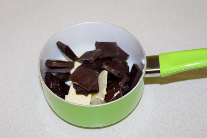 На водяной бане растопить шоколад с маслом. Слегка остудить.