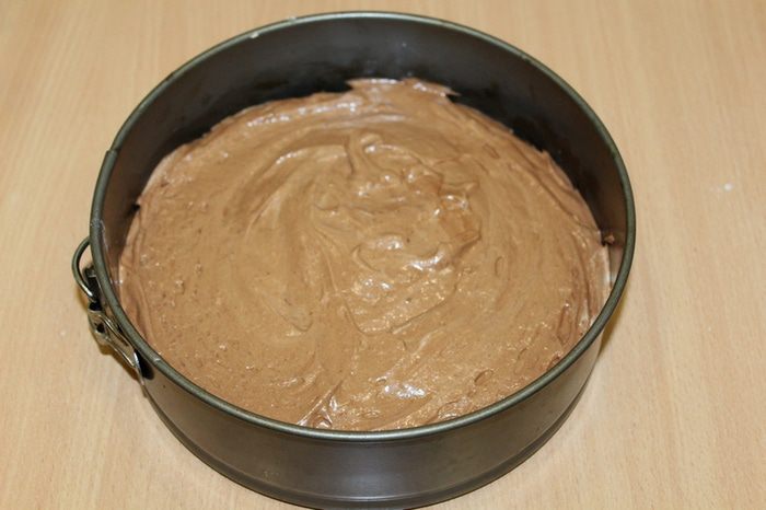 Бортики формы 20 см слегка смазать сливочным маслом, дно застелить бумагой для выпечки, выложить тесто и разровнять.