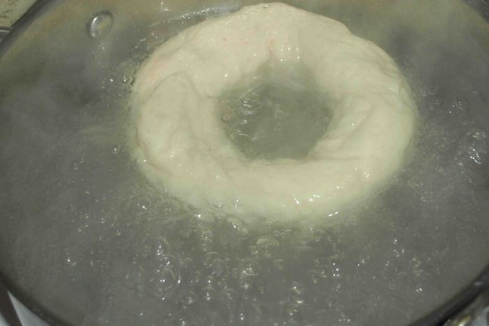 Достаем бублики из кипящей воды и выкладываем на противень, выложенный смазанной растительным маслом пекарской бумагой, или силиконовый коврик.