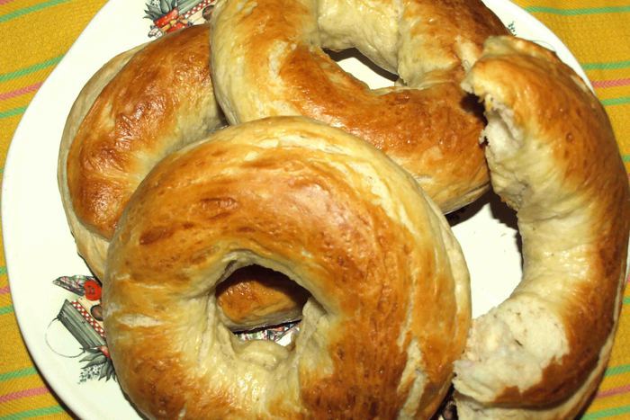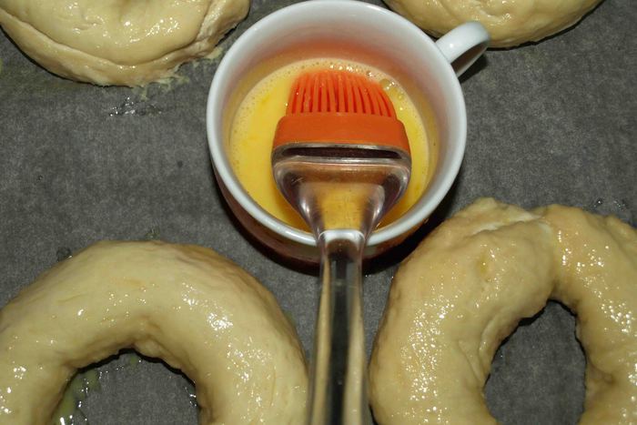 Яйцо взбить. Взбитым яйцом смазать бублики и отправить в заранее разогретую до 200°С духовку. Выпекать 15 — 20 минут.