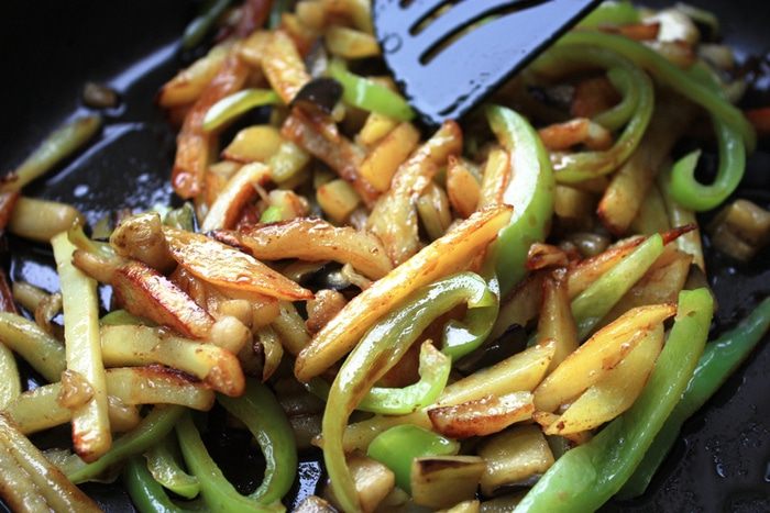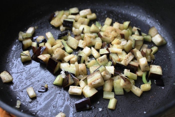 Баклажаны нарежьте пластинками, посыпьте солью и оставьте на полчаса, чтобы выделился сок. Промойте от сока, тщательно просушите и нарежьте небольшими кубиками. Обжарьте на кунжутном масле от Biolio до полуготовности, в конце добавьте сахар и обжаривайте еще буквально пару минут.