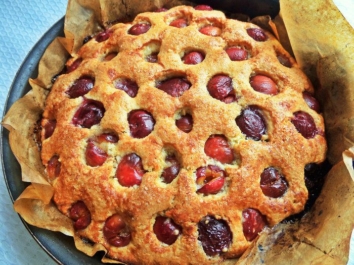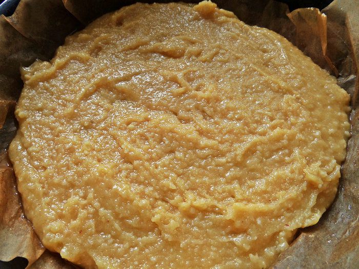 Съемную форму (21 см диаметр), выстелить смазанным пергаментом и вылить тесто.