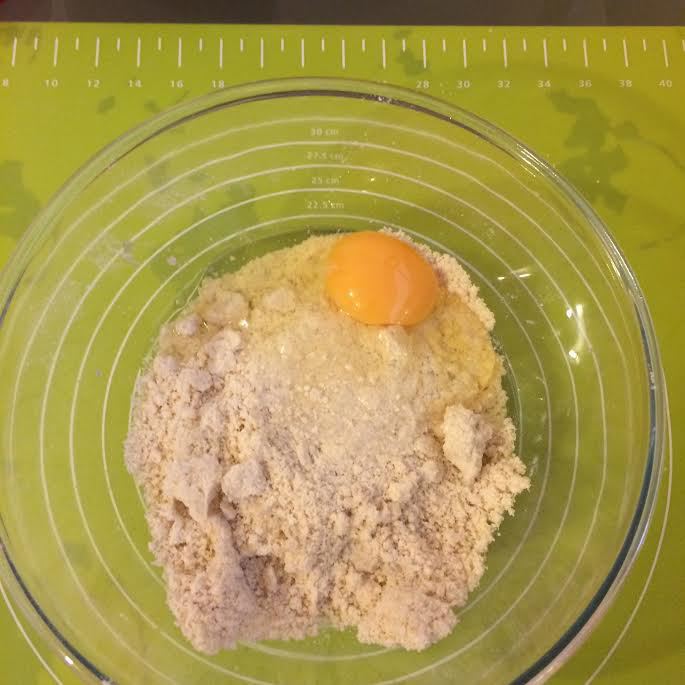 В миске смешать оба вида муки, соль, натертый пармезан и холодное масло. Перетереть все в крошку.