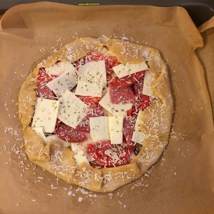 Перенести тесто на противень. Аккуратно завернуть края, смазать их молоком и присыпать тертым пармезаном.