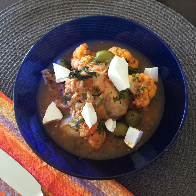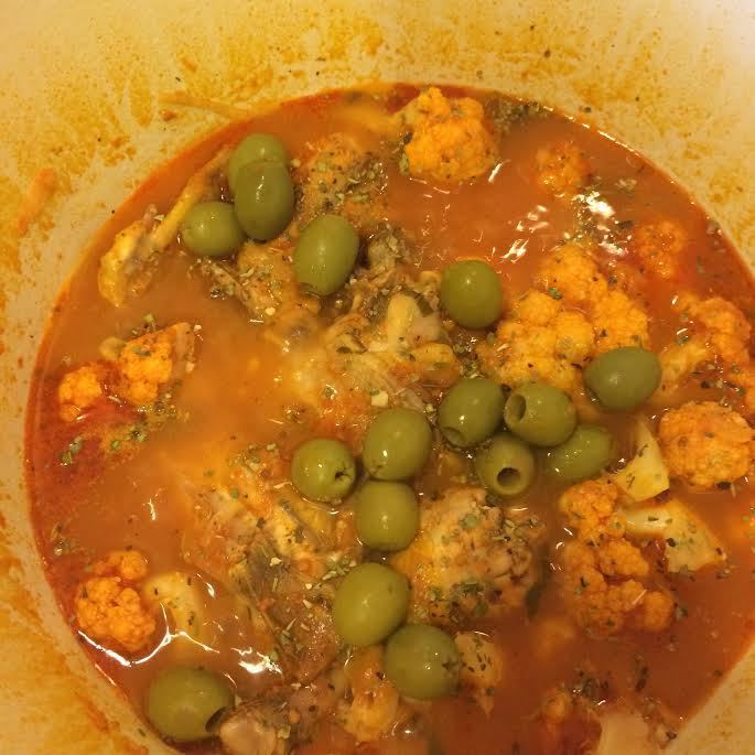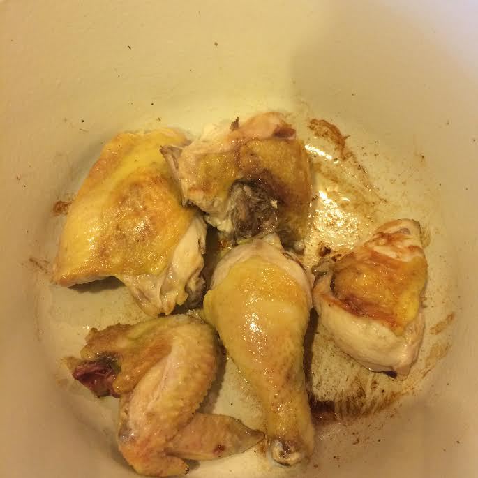 В кастрюле с толстым дном нагреть 1 ст. л. оливкового масла и обжарить курицу со всех сторон (5-10 минут). Достать и переложить курицу на тарелку.